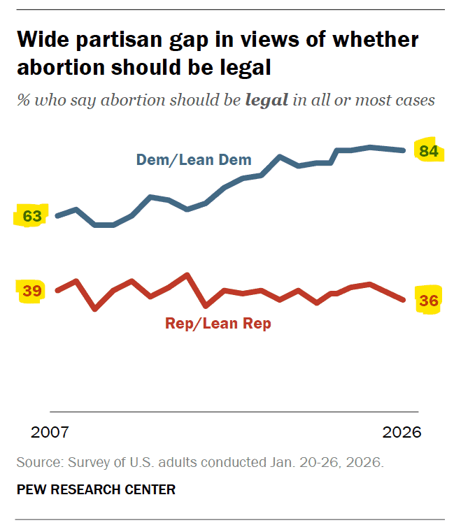 However, Democrat and Democrat-leaning voters favoring no or few limitations on abortion have risen dramatically from 63% in 2007 to 84% in 2026.