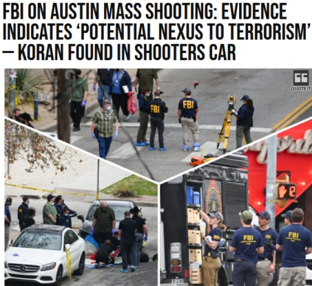 Speaking at the latest press conference, Doran told reporters that the FBI is working with the Austin Police Department to collect and process evidence at the scene, including the agency’s evidence response team and digital forensics specialists. Commenting on the nexus to terrorism, Doran said, “It’s still way too early in the process to determine an exact motivation, but there were indicators that, on the subject and in his vehicle, indicate potential nexus to terrorism.” . . .