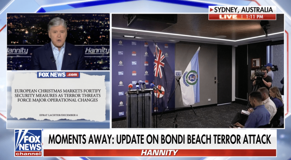 “Let’s go back to 9-11-01: 2,977 Americans killed that day, many more killed from 9/11-related illnesses. That is very real,” Hannity said. “Now, with Western civilization on multiple continents as we are reporting, and sadly as we all know too well, what happened here in Sydney is not an isolated incident.