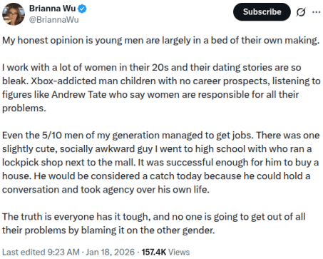 Or becoming the other gender, for that matter. As previously explained, John/“Brianna” has failed at everything he/“she” has ever done, and in nothing did he/“she” fail worse than being a man. It would be interesting to know the context of Wu’s assertion, “I work with a lot of women in their 20s.” Where do you do this? Because I’m pretty sure that the one thing you are not doing is work. If John/“Brianna” has recently begun an actual job somewhere, this news would shock the world, but my guess is that “work with” actually means chat with on the Internet, which is pretty creepy — the deranged middle-aged tranny freak sliding into the DMs of unsuspecting 20-something girls. At any rate, what could be more laughable than John/“Brianna” presuming to criticize young men for being “Xbox-addicted man children with no career prospects”? Exactly what “career prospects” has the former John Flynn achieved?
