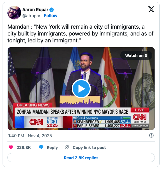 “New York will remain a city of immigrants, a city built by immigrants, powered by immigrants, and as of tonight, led by an immigrant,” he said in his Tuesday victory speech.