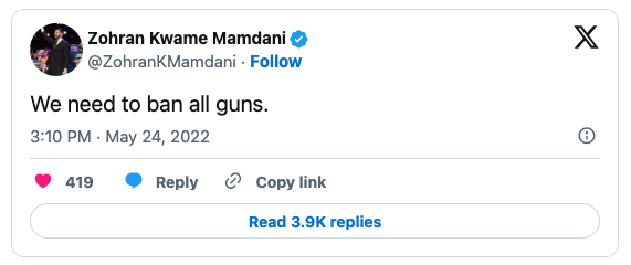 More ambitious still is New York City’s current mayor, Zohran Mamdani. In 2022, he went the full gun-seizure Monty, proclaiming: