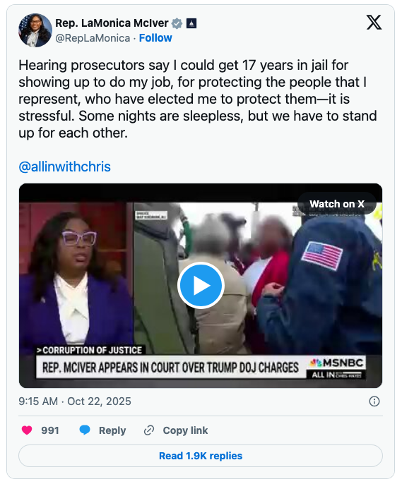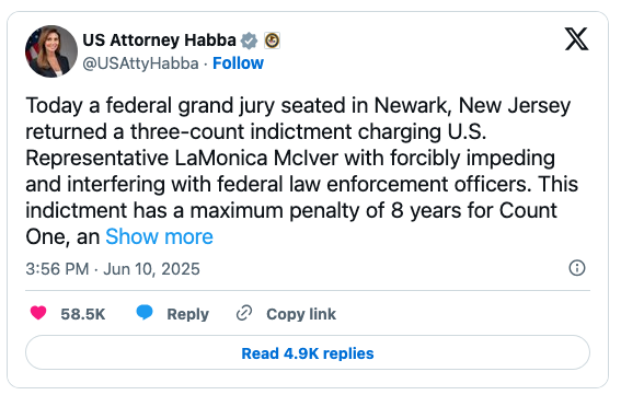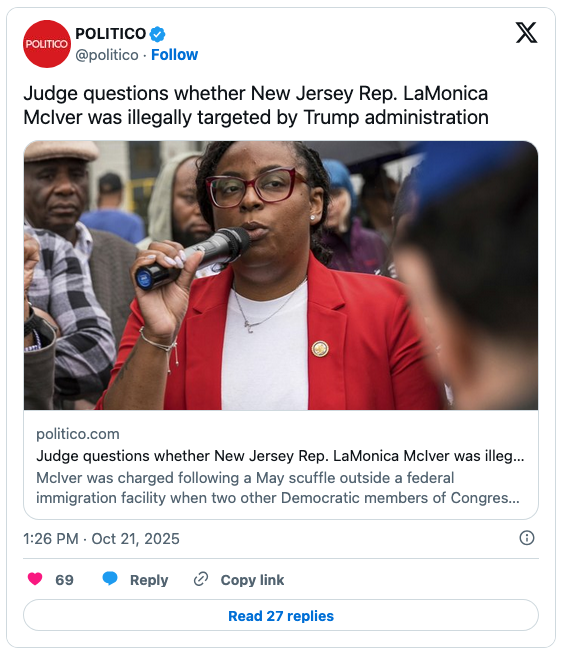 He “repeatedly asked how he could reach the conclusion that the Trump administration was targeting McIver following a May scuffle outside a federal immigration facility when two other Democratic members of Congress — Reps. Bonnie Watson Coleman and Rob Menendez — were also there but not prosecuted,” the website explained.