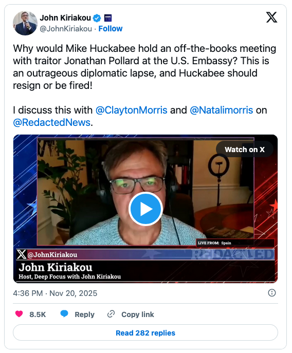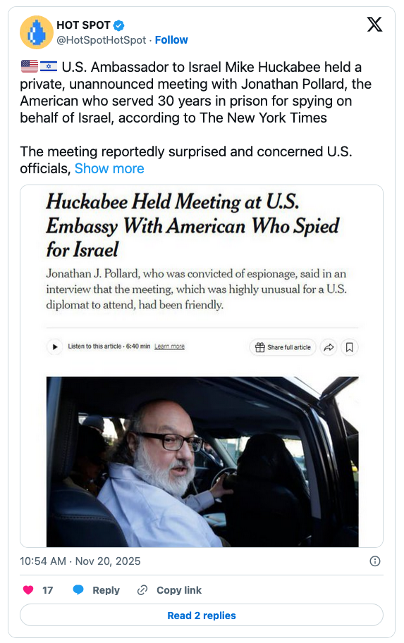 U.S. Ambassador to Israel Mike Huckabee met with American traitor and convicted Israeli spy Jonathan Pollard in Jerusalem.