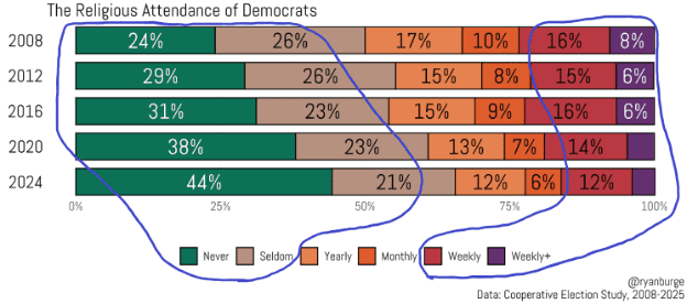 It is whole other story of fast-growing irreligiosity among the Democrats. Professor Burge explains, with bold type again, “For every Harris voter who attended church weekly in 2024, there were about 4 Harris voters who attended less than once a year.” Democrat no- and very-low attendees have “really skyrocketed in the last couples of cycles.”
