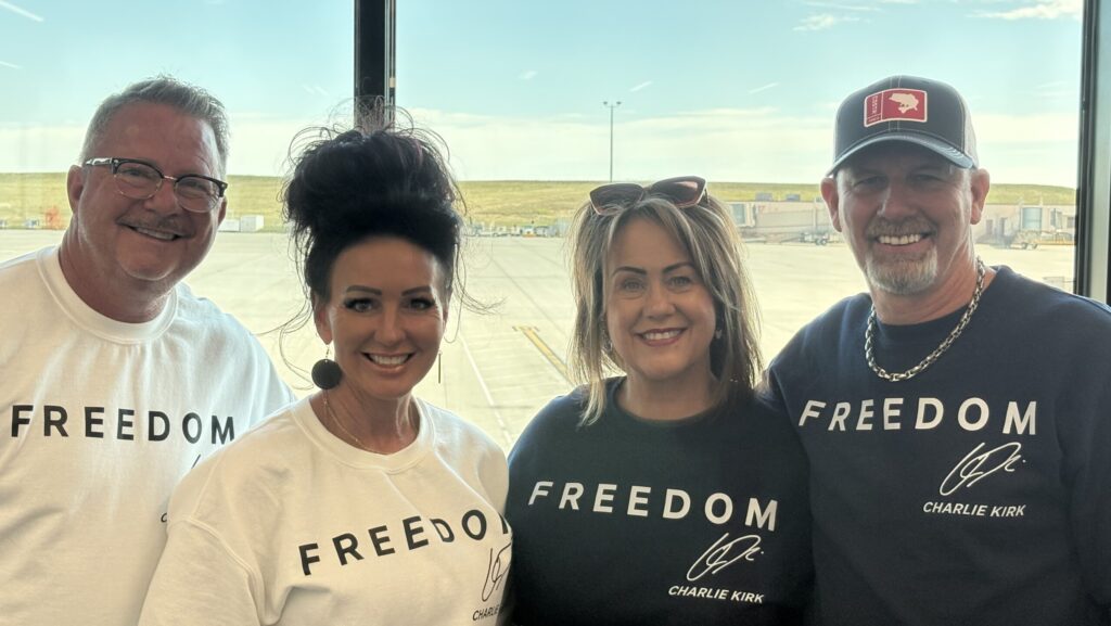 Reverend Doug and Christina Tipton and Mike and Tanya Alexander were wearing matching Charlie Kirk sweatshirts in the Colorado Springs airport when I approached them. I had assumed the couples were heading to Phoenix like me — but they didn’t need a special reason to support Charlie and his legacy.