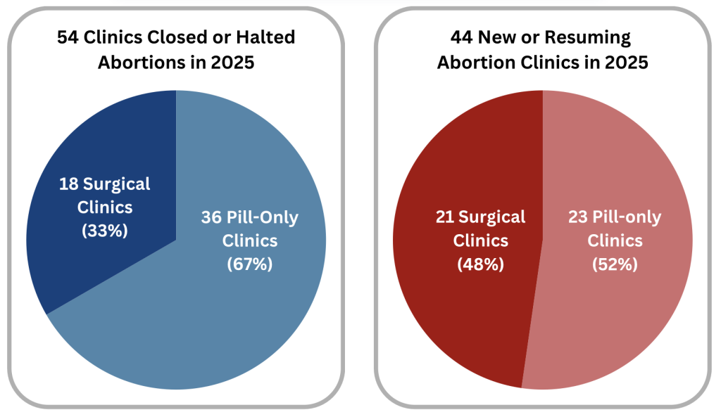 Operation Rescue also documented 44 clinics that opened or resumed abortions this year. The breakdown was nearly fifty-fifty, with 23 (52%) opening or resuming as pill-only clinics, and 21 (48%) opening or resuming as surgical clinics.