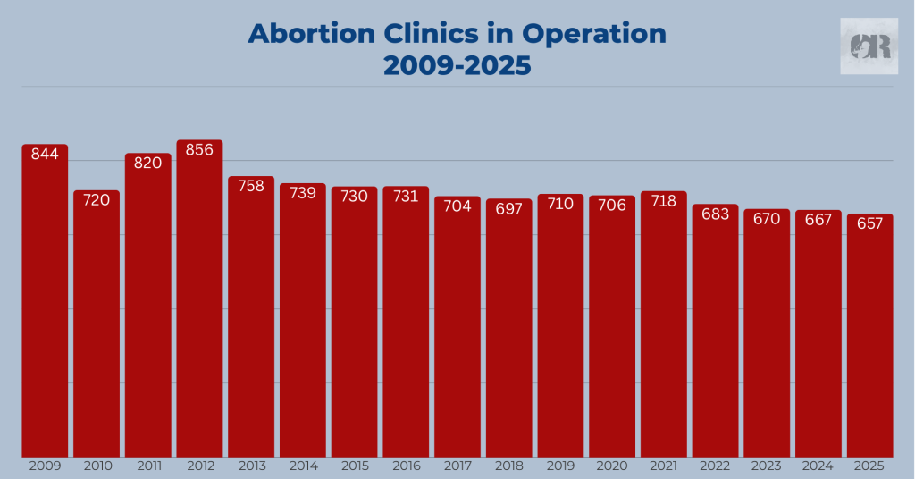 This progress is made even more evident in the comparison of clinics that existed in 1991, numbering 2,176 across the nation, to the number that remains today. A total count of 657 abortion clinics in 2025 shows a whopping 70% decrease in less than forty years.