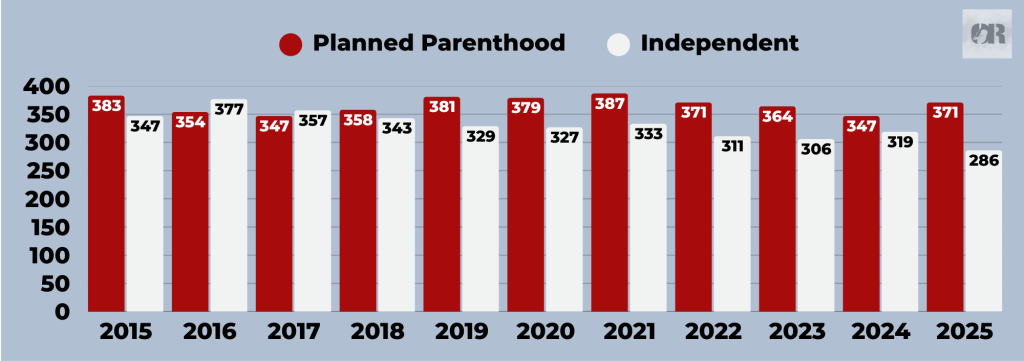 Planned Parenthood appears to be struggling to keep its hold on the market share of brick-and-mortar abortion clinics nationwide this year, dropping from 58.2% in 2024 to 56.5% in 2025 – likely due to the record number of Planned Parenthood closures and the abortion giant’s continued loss of funding and support.