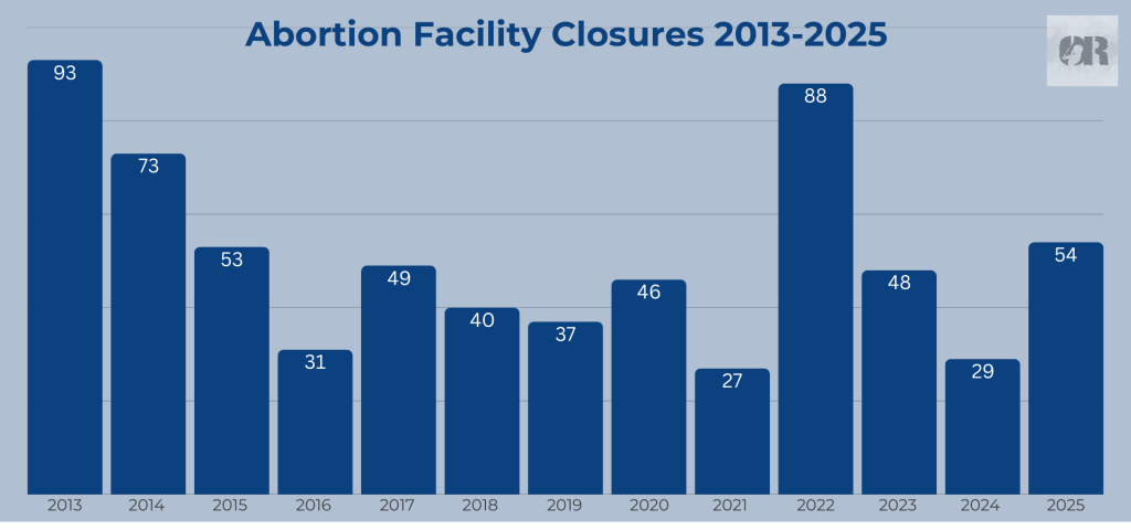 A record 54 clinics closed or halted abortions this year, the highest number of closures since 2022, when Operation Rescue verified 88 closures following the fall of Roe. Of those 54 closures, 36 (67%) were pill-only clinics, and 18 (33%) were surgical clinics.