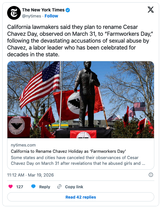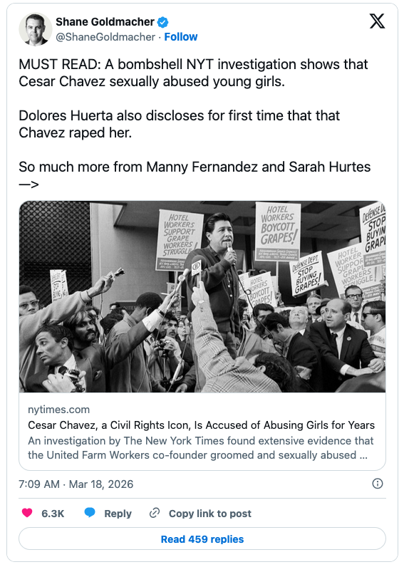 Not surprisingly, “a handful of Mr. Chavez’s relatives and former U.F.W. leaders have been aware for years about various allegations of sexual misconduct, but there is no evidence that they made efforts to fully investigate the accusations, acknowledge the victims or apologize to them,” the Times reported.