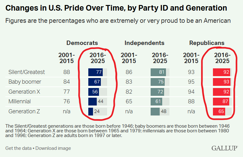 New Gallup polling data demonstrates our two national political parties have extremely different takes on whether citizenship in the United States of America is worthy of their pride.