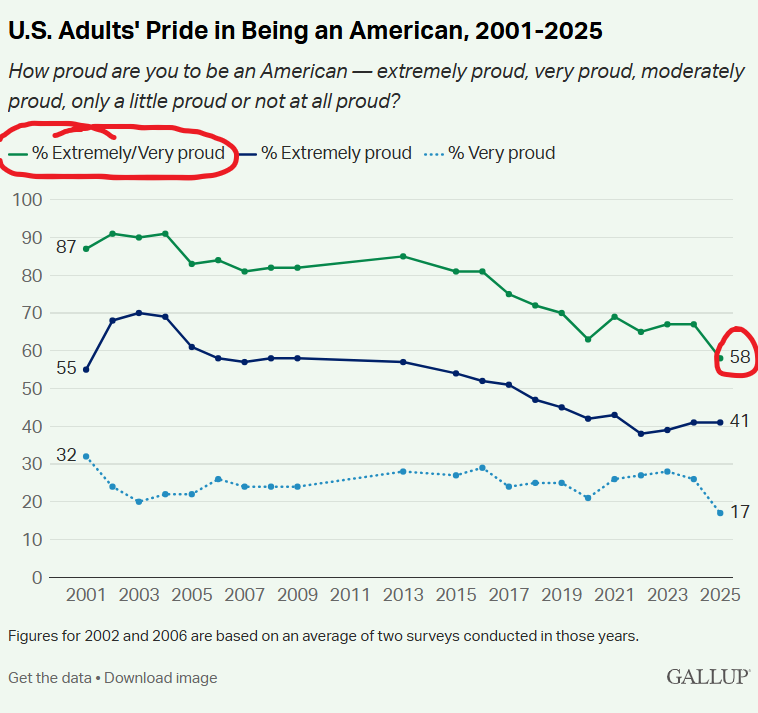 Gallup first started asking Americans how proud they were of their nation in January 2001 when 87% of Americans said they were “extremely” or “very proud” to be citizens of America. That number rose, hovering around 90 and 91% over 2002 to 2004, declining to 83% in 2005 and remaining roughly at that level until 2017 where it sank to 75%, and continued to decline to its present low of 58% in 2025.