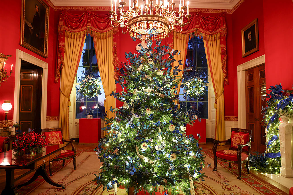 WASHINGTON, DC – DECEMBER 01: Blue butterflies are seen in the Red Room during an advance tour of the 2025 White House Christmas decorations on December 01, 2025 in Washington, DC. (Photo by Anna Moneymaker/Getty Images)