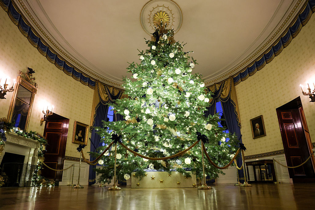 WASHINGTON, DC – DECEMBER 01: The White House Christmas tree is seen in the Blue Room during an advance tour of the 2025 White House Christmas decorations on December 01, 2025 in Washington, DC. (Photo by Anna Moneymaker/Getty Images)