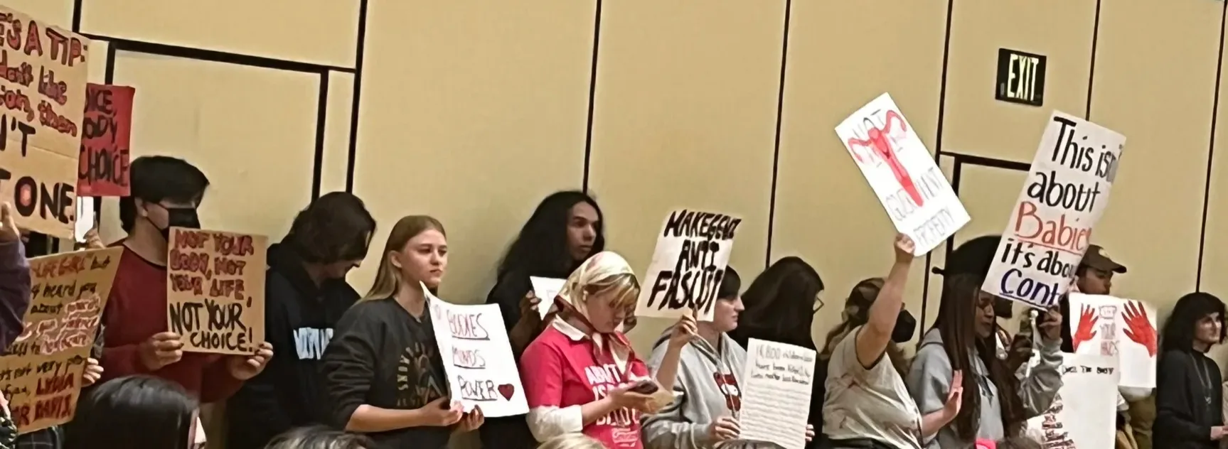 During the tabling and speaking events, some people in the crowd frequently heckled Davis, but otherwise the outreach was peaceful. Throughout the speaking event in the evening, the protestors, some of whom were masked, were lined along the wall of the ballroom (pictured).