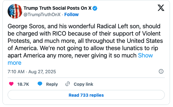 In recent days, Mr. Trump has revisited his grievances against Mr. Soros, long a boogeyman for the right, in part because he has backed progressive causes. After the killing of the right-wing activist Charlie Kirk in Utah this month, the president threatened to use the levers of government to silence liberal protesters and donors to progressive groups, including Mr. Soros.