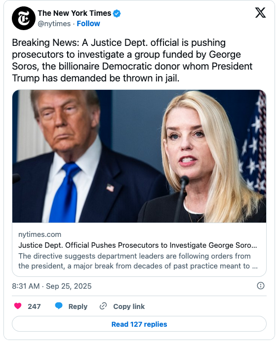 Noting that Trump wants to jail Soros, the Times reported that Trump is pushing Attorney General Pam Bondi to prosecute former FBI chief James Comey and New York Attorney General Letitia James. James is under investigation for mortgage fraud, as is far-left Democratic Senator Adam Schiff of California.