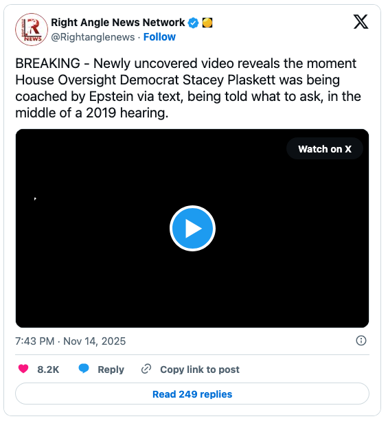 The Post also divulged that the time-stamps on the messages and their content coincided with video of the hearing. There followed a detailed rendition of the back-and-forth between the two. “The messages show that Plaskett texted Epstein before the hearing started that day, at 7:55 a.m. Eastern time, to tell him: ‘He’ll talk about his grades,’” the Post continued: