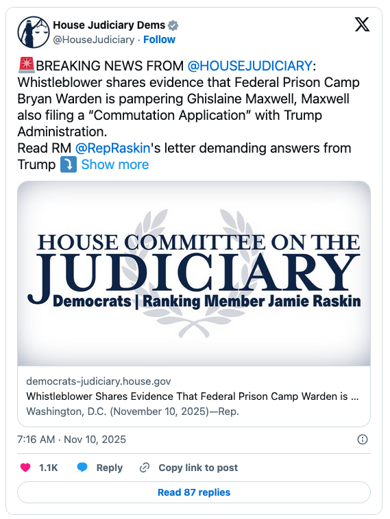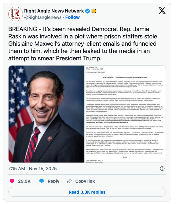 She landed in the news again last week when Maryland’s far-left Democratic Representative Jamie Raskin, Maxwell’s attorney alleged, leaked emails supposedly obtained from a whistleblower who works at the prison camp in Texas where she is imprisoned. The emails describe the nice life Maxwell has at the facility.