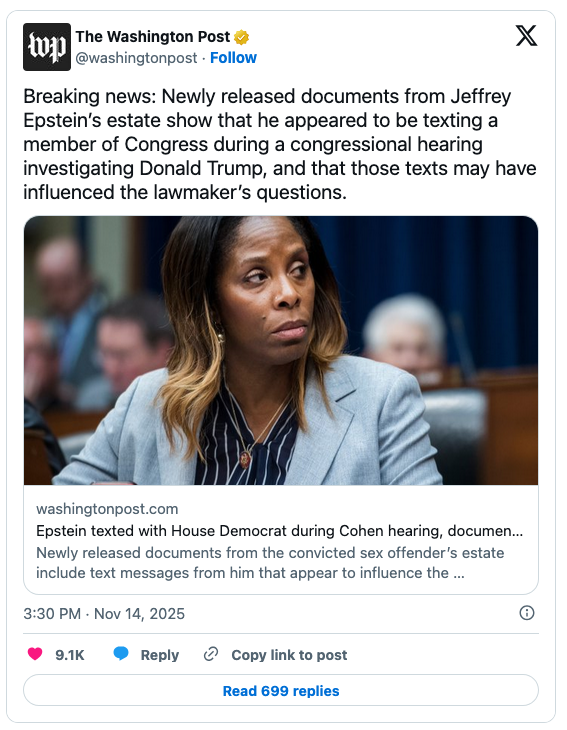 Jabbar’s answer to the Post is Capitol Hill code for “of course, she was texting with Epstein, but she’ll never admit it.”