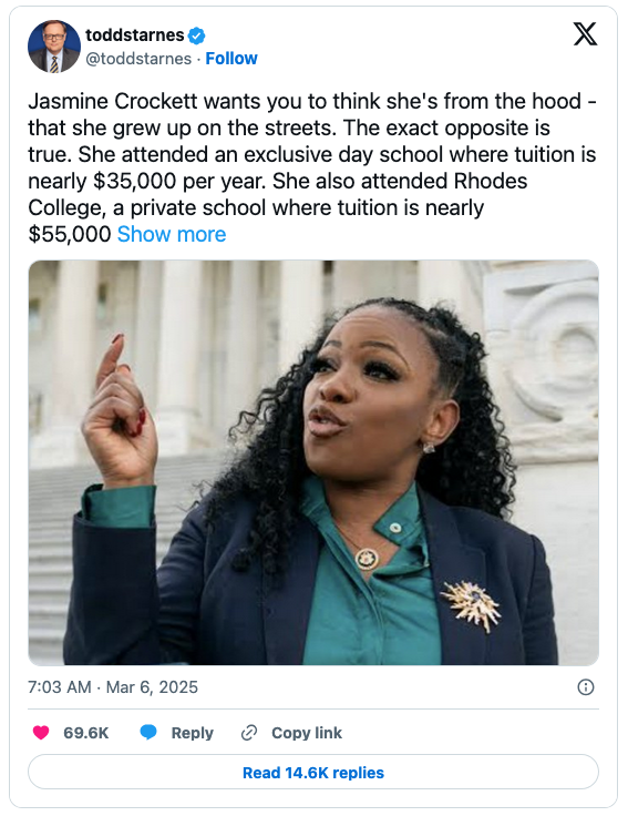 As for Crockett’s fakery on her origins, Fox News’ Todd Starnes accurately explained her past on X.