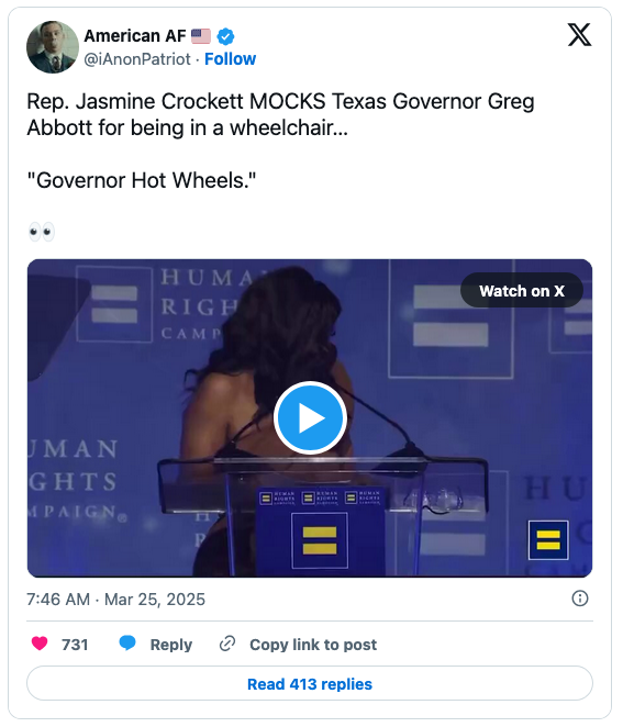 • She called called paraplegic GOP Texas Governor Greg Abbott “Governor Hot Wheels”;