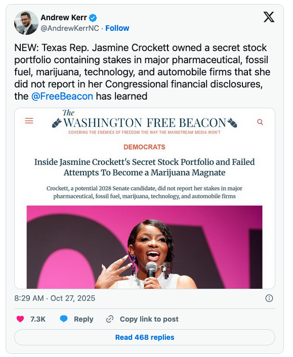 The Washington Free Beacon disclosed the possible violation today. Crockett “owned stocks in at least 25 companies that she did not disclose to the public during her first congressional run in 2022, even though she’d quietly admitted to the holdings the previous year as a Texas state legislator,” the website reported. Nor did she disclose the holdings when she landed in Congress in 2023.