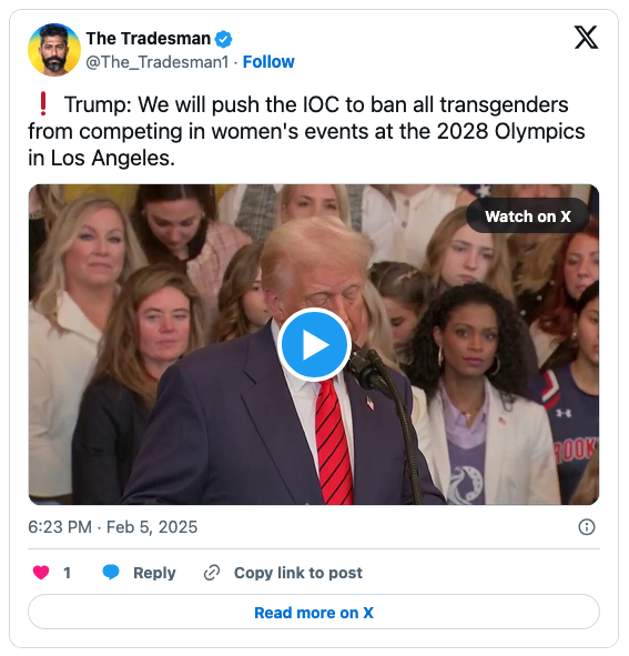 Speaking to a crowd in connection with the order, Trump said that “trans women” will not compete in women’s events at the Los Angeles Olympics in 2028.
