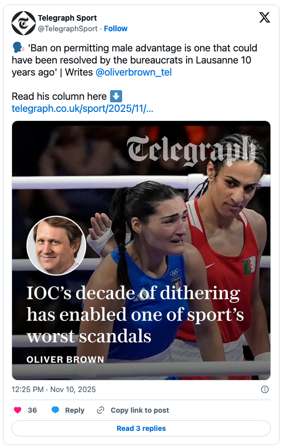 Oliver Brown, The Telegraph’s head sportswriter, explained that the decision is 10 years too late, and made only after the IOC permitted two men to compete as women in boxing. Not surprisingly, they beat the women to a pulp.