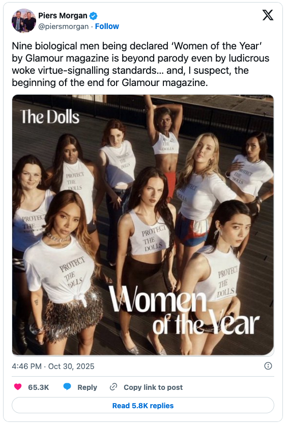 The far-left media is still pushing the “trans” agenda, however. In October, Glamour UK named five men “women of the year.”