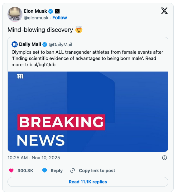 If Brown is right, The Times’ headline “Transgender women to be banned from all female Olympic events” is wrong. It should read: “Men to be banned from all female Olympic events.”