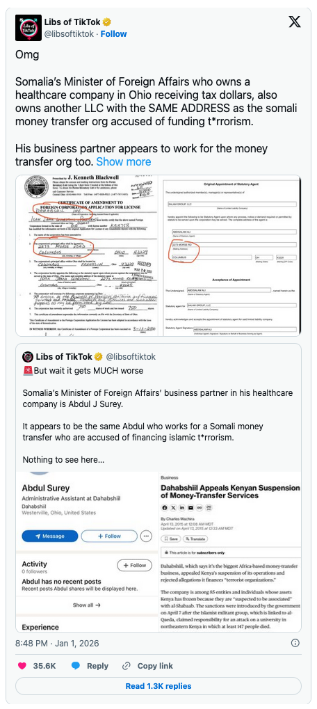 Libs of TikTok (LOTT) revealed on X that Somali Foreign Minister Abdisalam Ali owns a taxpayer-subsidized healthcare company. And his business partner works for a money-transfer outfit that authorities in Kenya had linked to terrorism.