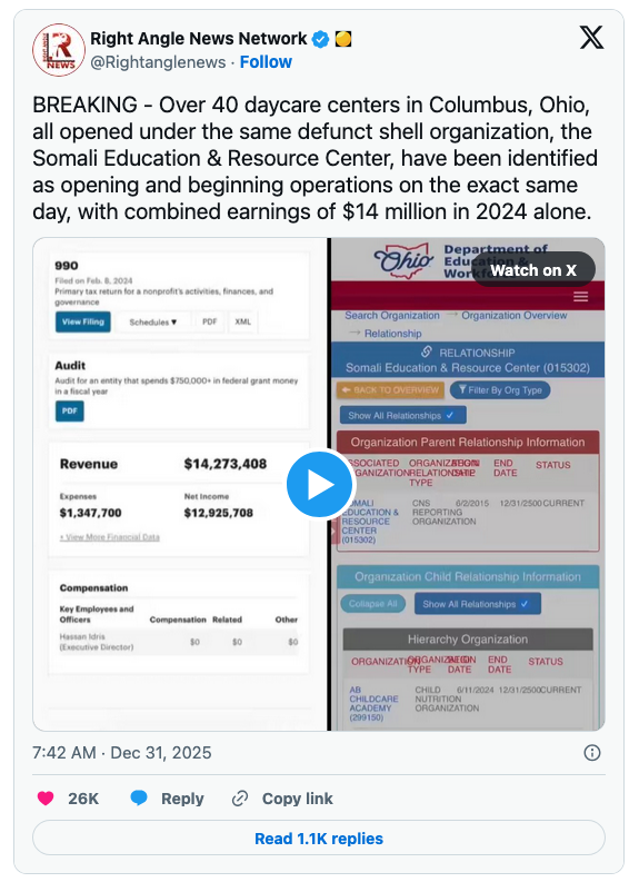 Another X account, Right Angle News Network, reposted news from The Coerced Nurse that 40 daycare centers in Columbus “all opened under the same defunct shell organization, the Somali Education & Resource Center.” They “have been identified as opening and beginning operations on the exact same day, with combined earnings of $14 million in 2024 alone.”