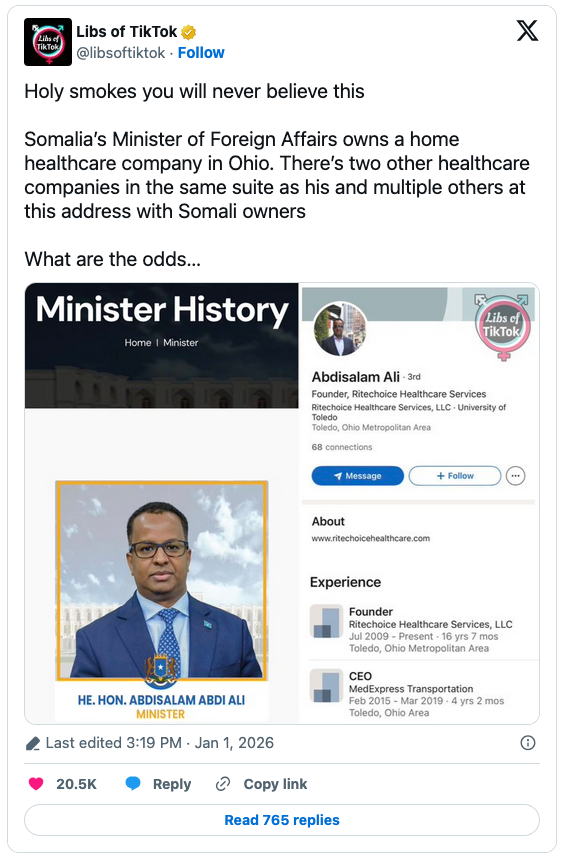“Somalia’s Minister of Foreign Affairs owns a home healthcare company in Ohio,” the X feed reported: