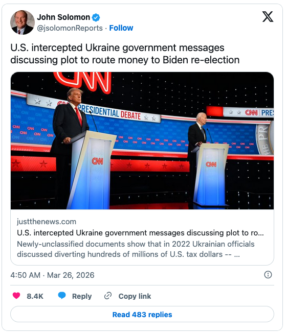 The website reported that “U.S. intelligence intercepted Ukrainian government communications discussing a plot to route hundreds of millions of American tax dollars earmarked for clean energy in the war-torn country and move them to the United States to enrich then-President Joe Biden’s 2024 re-election campaign and the Democratic National Committee [DNC].”