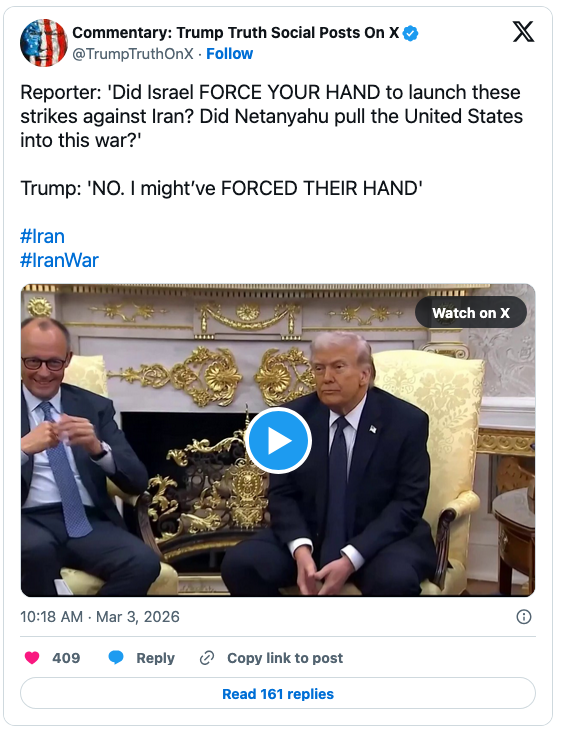 Asked directly whether Israel forced his hand, Trump said, “No, I might have forced their hand.”