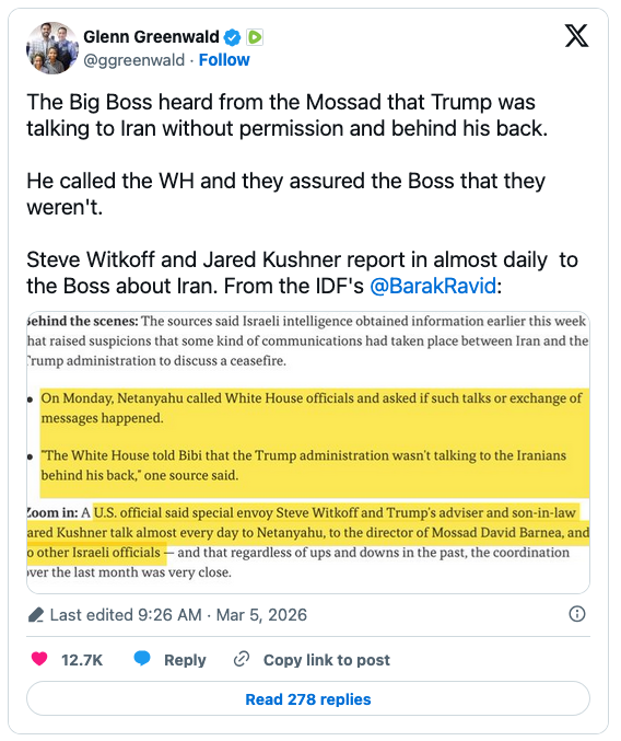 Independent journalist Glenn Greenwald, a fierce critic of Israel and its influence over U.S. Middle East policy, ridiculed Netanyahu, Witkoff, and Kushner on X.