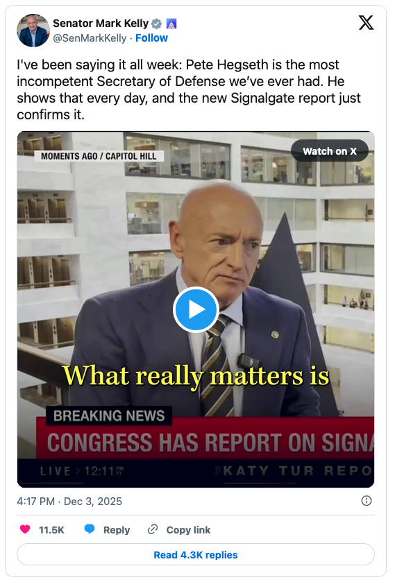 “I’ve been saying it all week: Pete Hegseth is the most incompetent Secretary of Defense we’ve ever had. He shows that every day, and the new Signalgate report just confirms it,” Kelly wrote on X.
