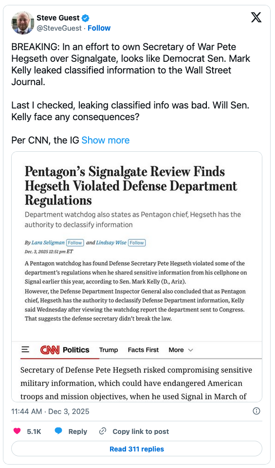“In an effort to own Secretary of War Pete Hegseth over Signalgate, looks like Democrat Sen. Mark Kelly leaked classified information to the Wall Street Journal,” Steve Guest wrote on X: