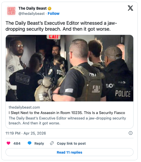 After Allen was subdued and the chaos had ended, myriad security officials blocked The Daily Beast’s Dougherty from returning to his room. “I knew then that I had been next door to the man who wanted to turn the White House Correspondents’ Association dinner into a mass shooting,” he wrote.