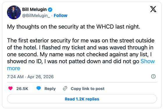 Fox News’ Bill Melugin reported on X that he easily entered the Washington Hilton Saturday night and could have hidden a bomb in his shoe. Hugh Dougherty, executive editor of The Daily Beast, said much the same thing. That lax security, apparently, allowed attempted assassination suspect Cole Allen to waltz into the Hilton with multiple weapons, register for a room, and await his chance to assassinate Trump and other top officials.