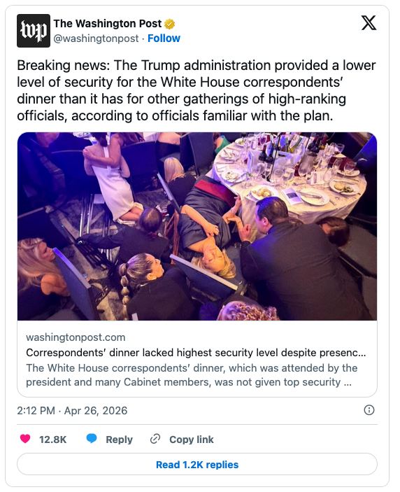 Top administration officials apparently didn’t think having myriad top officials, notably the president and vice president, at a public event was much of a security problem. The administration “provided a lower level of security for the White House correspondents’ dinner than it has for other gatherings of high-ranking officials, even though the president and many Cabinet members were in attendance,” officials told the Post.