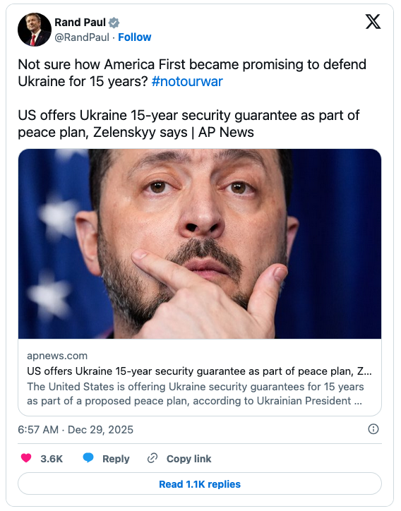 Sen. Rand Paul (R-Ky.) — among the staunchest of noninterventionists — commented on the proposal, saying, “Not sure how America First became promising to defend Ukraine for 15 years?”
