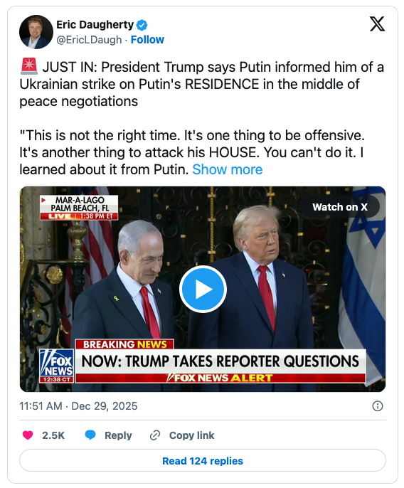 Before the alleged attack on Putin’s house, the White House had been working on building consensus toward the latest version of a peace deal that became publicly known back in November. Trump and Zelensky met at Mar-a-Lago on Sunday, and Trump talked to Putin that same day. He told reporters, “I do think we’re getting a lot closer.”