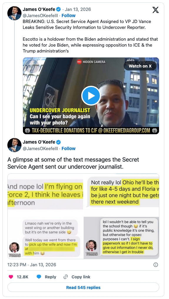 This time, the agent revealed secrets about Vice President J.D. Vance’s protective detail, its schedule, and how the vice president travels. Tomas Escotto, now on administrative leave, disclosed the security information to an undercover reporter from the O’Keefe Media Group (OMG).