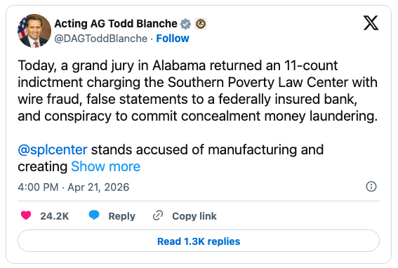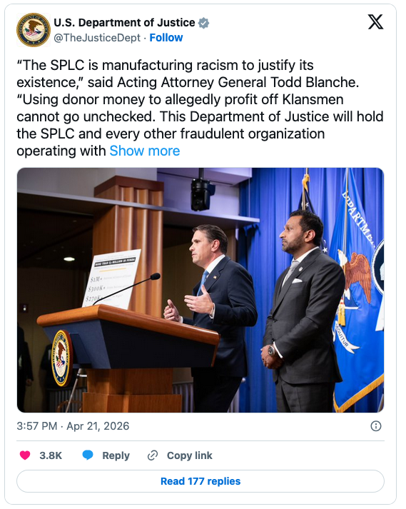 “The SPLC is manufacturing racism to justify its existence,” Acting Attorney General Todd Blanche told reporters at a news conference:
