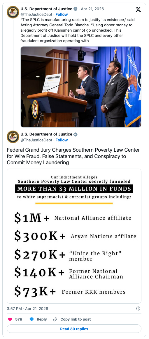 Using donor money to allegedly profit off Klansmen cannot go unchecked. This Department of Justice will hold the SPLC and every other fraudulent organization operating with the same deceptive playbook accountable. No entity is above the law.