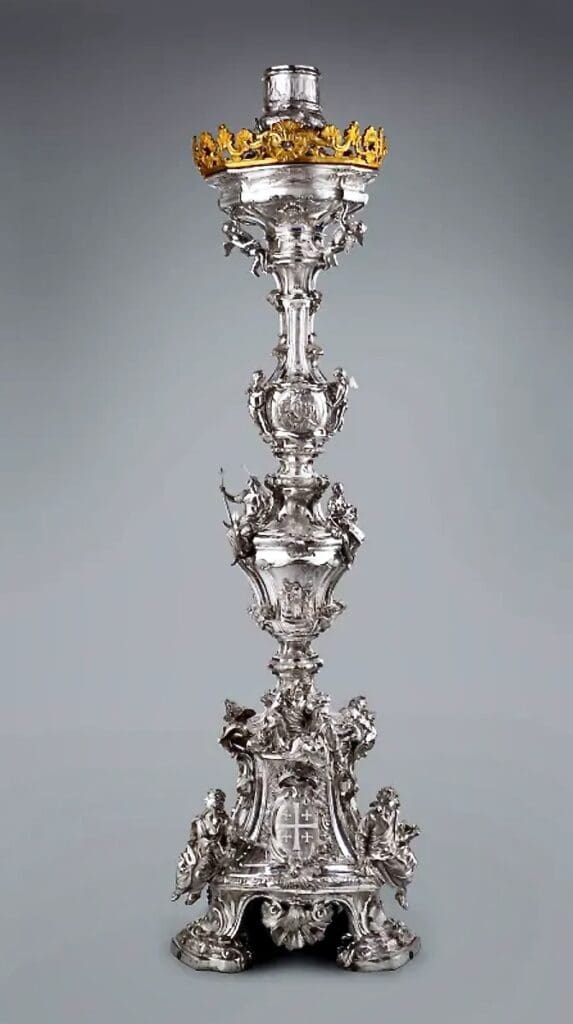 The relationships among Christians in the Holy Land have not always been amicable: “After the Greek Orthodox clergy ransacked the Holy Sepulcher, on April 2, 1757, the Custody managed to recover a number of damaged objects and bought back others that had been stolen.” Some of the silver was subsequently used to create the torchères.
