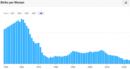 However, once those children reached adulthood — the first Baby Boomers, born in 1946, turned 18 in 1964 — birth rates swiftly plummeted, and by 1973 were below “replacement rate” (2.1 TFR) needed to maintain population stability. For more than 15 years, TFR never reached replacement level and, when it finally (and just barely) did so in 1990, this was mainly due to higher birth rates among immigrant women, of whom there were a lot more than there had been 15 years earlier.